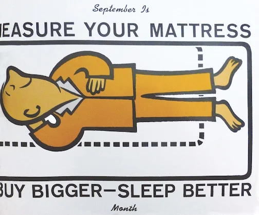In the late 1950s, the bedding industry joined forces with their suppliers—the United States Steel Corp., the Latex Foam Rubber Council of the Rubber Manufacturers Association and the Cotton Batting Institute—to launch a media blitz designed to convince ever-expanding average Americans that they needed bigger beds. With funding from several industries, they published magazine articles, sent scripts to media outlets, and blanketed their retail outlets with information on how to measure one’s mattress so that consumers could “Buy Bigger, Sleep Better!”